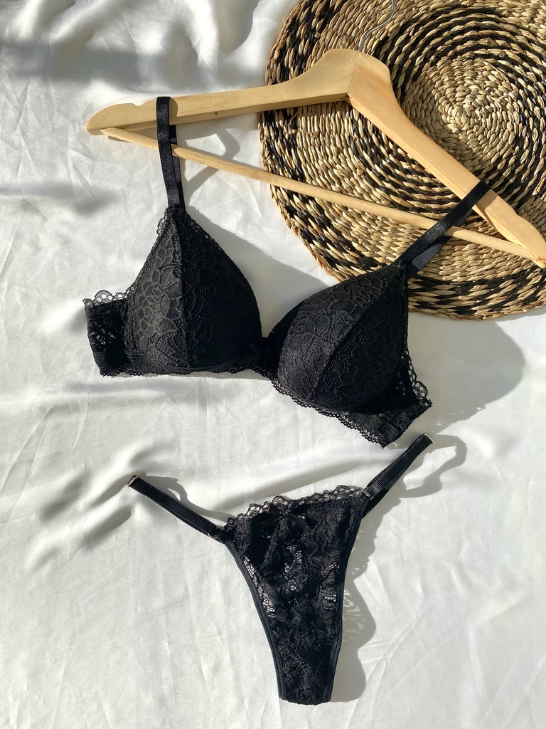 Corpiño triangulito soft (con taza sin aro) en conjunto con less regulable de puntilla. Un corpiño que permite un sostén súper natural, su taza es muy flexible y liviana. Y tiene coleta, para sujetar el contorno. Comodidad y belleza.